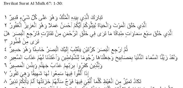 Ayo sahabat yang seiman, mumpung masih ada waktu segera usahakan membaca surat Al Mulk setiap hari, karena begitu besar khasiatnya di alam kbur nanti.